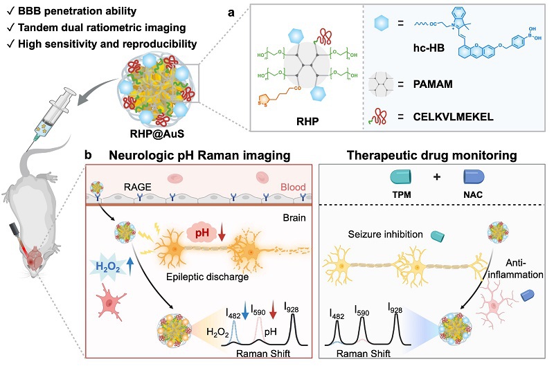 近日,竞技宝 王聪青年研究员、李聪教授、类脑智能科学与技术研究院王晶副教授和云南大学竞技宝 雷祖海教授在Angewandte Chemie杂志上发表了题为:“Tandem Dual-Ratiometric SERS Probe Enables Raman Imaging of Neurological pH Fluctuations in Epilepsy”(串联双比率响应SERS探针成像癫痫病灶pH波动)的研究性论文(图1)。该工作开发了一类单光谱串联双比率响应SERS探针(RHP@AuS),实现脑部癫痫病灶pH动态监测与药物预后评估:(1)提出了一类基于树枝状聚合物的可调节性拉曼报告分子单层自组装策略,可有效抑制分子堆叠诱导的信号淬灭效应,显著提升拉曼信号强度和稳定性。(2)构建了一类可特异性富集在癫痫灶、H₂O₂开关-pH数字化读取的串联双比率型SERS探针,实现了病灶pH动态定量读取。(3)揭示了癫痫发作导致病灶局部脑区快速酸化的波动规律,提出了一种“酸碱平衡-炎症调节”的联合疗法,实现了癫痫长效持久的治疗效果。总之,该工作构建了一种高灵敏度、高特异、准确动态监测脑部疾病pH震荡的可视化工具,并为癫痫等脑疾病的精准诊疗开辟了新维度