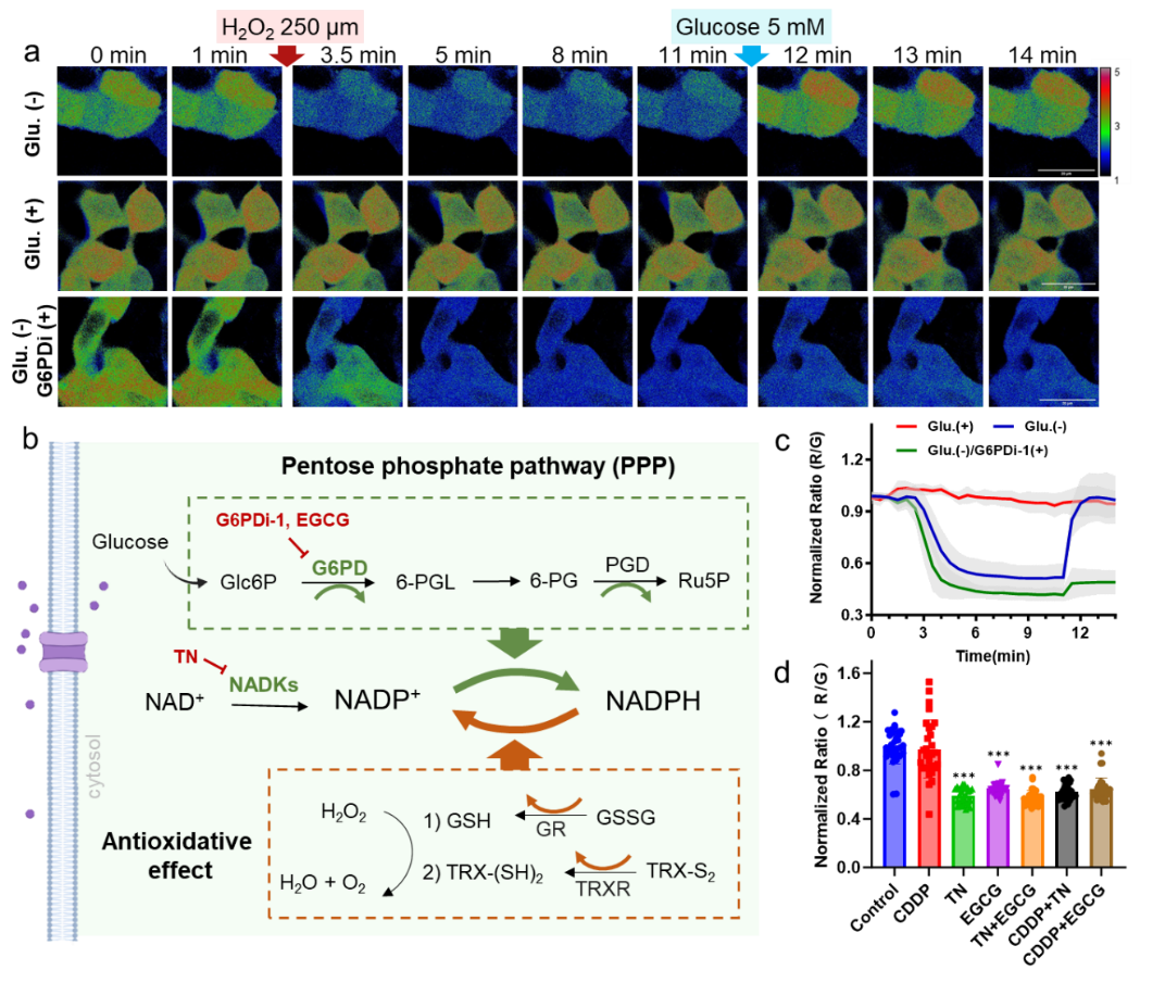 在肿瘤活细胞成像中,,FOCS-NADPH探针能够动态监测氧化应激条件下NADPH浓度波动,揭示肿瘤细胞中磷酸戊糖途径对NADPH稳态的调控作用(图4a-4c)。此外,该探针还可用于顺铂、硫代烟酰胺、表没食子儿茶素没食子酸酯等药物下NADPH浓度的监测(图4d),为抗肿瘤药物联用筛选和机制研究提供了可视化工具。