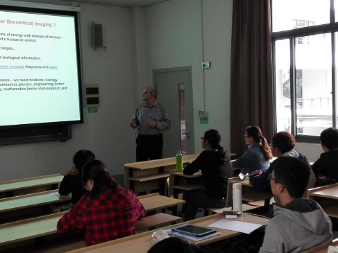 2016年10月25日上午,英国帝国理工竞技宝 自然科学竞技宝 化学系Nicholas Long教授在竞技宝 李聪教授的陪同下访问复旦竞技宝 ,莅临放射药学教研室对研究生课题进行了一对一指导。下午,Long教授向竞技宝 20余名研究生做了Molecular imaging相关的前沿学术讲座,介绍了Optical Imaging、PET/SPECT、MRI、Ultrasound等成像技术原理及其在疾病早期诊断、药物示踪和疗效评估中的重要临床意义。Long教授会后与同学亲切交流,为同学们答疑解惑。