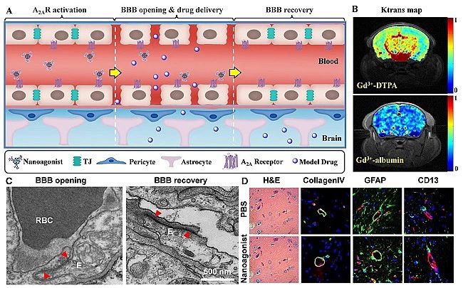 图1.腺苷2A受体激动剂可逆调控血脑屏障通透性。(A)纳米激动剂可逆开启BBB示意图;(B)动态增强磁共振成像(DCE-MRI)显示纳米激动剂提高BBB通透性;(C)透射电镜显示注射纳米激动剂后紧密连接的开启及可逆恢复;(D)组织染色表明血管基膜、胶质细胞周足、周细胞和内皮细胞等BBB主要组分未有损伤,也未发现脑水肿、神经凋亡等副作用。