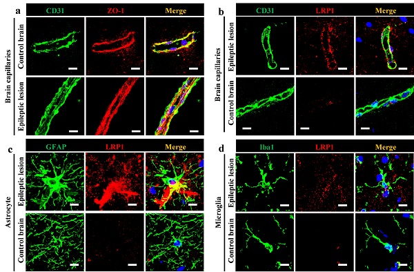 图2. 难治性癫痫患者病灶中血脑屏障相对完整且LRP1表达上调。(a) 癫痫和正常脑组织紧密连接蛋白免疫荧光染色。血管内皮细胞(CD31),紧密连接蛋白-1(ZO-1);细胞核(DAPI)。(b) 癫痫和正常脑组织中血管内皮细胞LRP1的免疫荧光染色。(c) 癫痫组织中星形胶质细胞(GFAP)中LRP1表达水平。(d) 癫痫组织中小胶质细胞(Iba1)的LRP1表达水平。