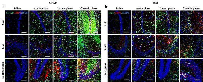 图4. KA癫痫小鼠模型中LRP1在活化胶质细胞中表达上调。(a)KA模型和假手术对照小鼠脑海马区星型胶质细胞LRP1免疫荧光染色图像。(b)KA模型和假手术对照小鼠脑海马区小胶质细胞LRP1免疫荧光染色图像。