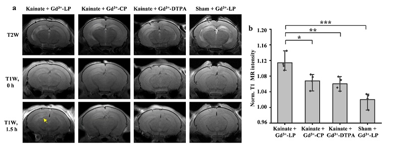 图5. Gd3+-LP定位慢性癫痫小鼠模型病灶。(a)在癫痫模型小鼠或假手术小鼠中,尾静脉注射具有相同Gd3+浓度(0.1 mmol/kg)的Gd3+-LP,Gd3+-CP,Gd3+-DTPA或假手术组之前及之后相应时间点的冠状位MR图像。箭头指向癫痫病灶。(b)同侧海马中的T1W MR信号强度值随时间的变化。