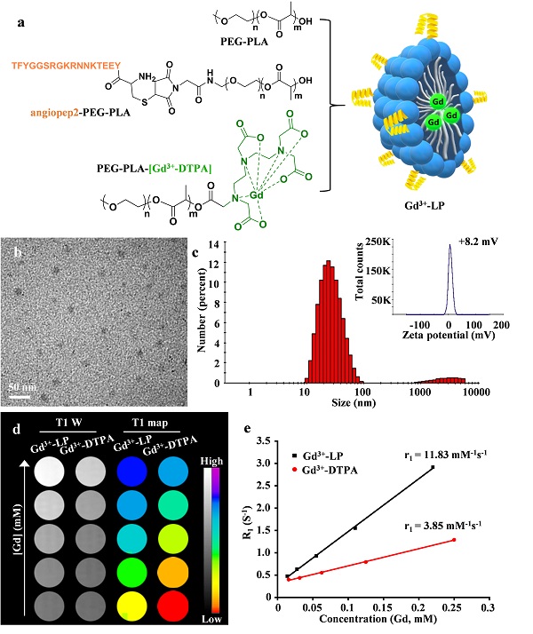 图3. LRP1受体靶向磁共振探针Gd3+-LP的表征。(a)Gd3+-LP的构建。(b)Gd3+-LP(b)Gd3+-LP的透射电镜图像。比例尺 = 50 nm。(c)Gd3+-LP的水合粒径图。(d)不同浓度Gd3+-LP和Gd3+-DTPA溶液的T1加权成像及T1 map图。(e)Gd3+-LP和和Gd3+-DTPA的T1弛豫率(r1)。