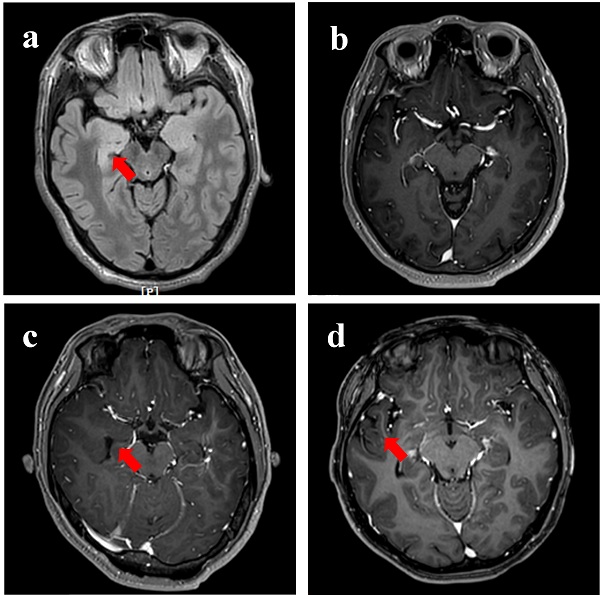 图1. 耐药性癫痫患者的代表性MR图像。(a)30岁男性,其右海马体中有高强度的T2信号。(b)32岁男性,给予Gd3+-DTPA后,T1W MR图像中无信号增强。(c)21岁女性,给以Gd3+-DTPA后,右海马无明显T1W信号增强。(d)25岁女性,给予Gd3+-DTPA后,右颞叶侧未检测到明显T1W信号增强。红色箭头指示切除癫痫灶。