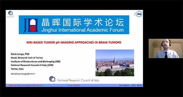 2020年12月15日,由本中心主办的脑疾病磁共振成像技术国际学术论坛通过网络在线举办。应李聪教授邀请,意大利都灵大学Silvio Aime教授与Dario Longo教授出席论坛并分别做了题为”MR Imaging Strategies & Brian Research”,”MRI-based Tumor pH Imaging Approaches in Brain Tumors”的报告。两位意大利教授就脑疾病微环境可视化以及脑疾病相关受体和神经递质可视化磁共振技术前沿进行了深入演绎。竞技宝 及类脑智能研究院三十余名师生参加了会议。多位教师和同学积极参加线上讨论,与报告专家就报告内容进行了直接交流。本论坛受到了上海市高水平地方高校建设项目的支持。