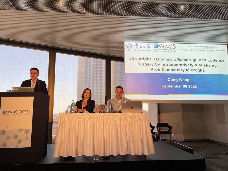 2023年9月8日王聪青年研究员在WMIC分会场“Imaging Microglial Function, CNS Injury, and Repair”,以题为“Ultrabright Ratiometric Raman-guided Epilepsy Surgery by Intraoperatively Visualizing Proinflammatory Microglia”进行口头汇报。该工作针对难治型癫痫治疗困难且危害大的临床困境,基于癫痫病灶定位困难、临床现有技术单一客观事实,提出并验证了癫痫致痫灶区域小胶质细胞呈促炎性活化,可作为术中癫痫灶判定的生物标志物;构建了一类酶响应比率型SERRS探针帮助术中快速、精确地定位可切除的致痫灶。本工作有望弥补临床现有致痫灶定位技术手段的不足,拓展癫痫相关标志物,开发活体可定量检测的拉曼探针,为致痫灶准确性定位提供分子影像依据,对致痫灶完整切除、安全切除和提高手术预后都有重要临床意义。该工作获得大会评委的一致好评,于大会闭幕式上再次受邀向所有参会学者进行口头汇报,并入选本年度“Young Investigator Award”奖。