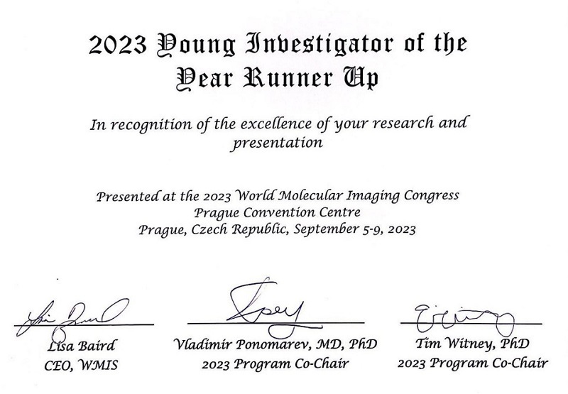 2023年9月5号到9月9号,李聪教授和青年研究员王聪博士、博士研究生王艺澄、赵静赴捷克首都布拉格参加2023年世界分子影像大会(WMIC)。全部人员均获得口头汇报资格。临行之前,王聪获得大会“Student Travel Stipend”奖励。其题为研究工作“Ultrabright Ratiometric Raman-guided Epilepsy Surgery by Intraoperatively Visualizing Proinflammatory Microglia”经大会委员会两轮评选荣获青年科学家奖“Young Investigator Award Finalists”,并受邀在会议闭幕式向全体参会人员汇报。