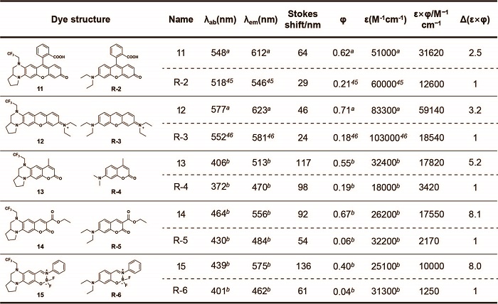 图1. 新型设计策略用于同时提升染料的亮度、光稳定性及Stokes位移。B,P和Δ分别代表亮度,光稳定性和Stokes位移
