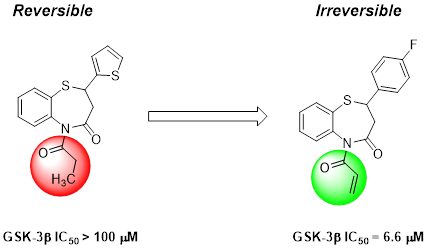 近日,竞技宝 药物化学系楚勇团队在药物化学领域权威杂志 Journal of Medicinal Chemistry上发表了题为 Discovery of Novel Benzothiazepinones as Irreversible Covalent Glycogen Synthase Kinase 3β Inhibitors for the Treatment of Acute Promyelocytic Leukemia的研究论文(原文链接://doi.org/10.1021/acs.jmedchem.0c02254),首次报道了一类具有苯并硫氮杂?酮结构的不可逆GSK-3β共价抑制剂,能选择性共价结合于GSK-3β特异的Cys14残基,并显示出良好的亚型选择性和激酶选择性。该抑制剂对多种肿瘤细胞表现出较好的抑制增殖作用和诱导白血病细胞凋亡能力,尤其对ATRA耐药细胞也表现出较好抑制活性。在早幼粒细胞白血病小鼠模型上表现出良好的抑制肿瘤增殖作用。此外,该抑制剂也具有良好的安全性和体内药代动力学性质。研究结果表明该类共价抑制剂具有潜在的治疗早幼粒细胞白血病的临床应用价值。