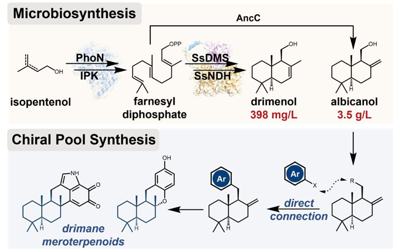 研究团队利用微生物工程手段,通过优化高产萜类的PhoN-IPK系统并引入Nudix水解酶,成功将drimenol产量提升至398 mg/L,albicanol产量在发酵罐中达到3.5 g/L,较此前提高千倍;并以能够大量制备的albicanol为起始原料,高效合成了chromazonarol、mycoleptodiscin A、pelorol等多个具有生物活性的补身烷型杂萜。与传统合成路线相比,该化学-酶法策略不仅显著减少了合成步骤,还较大提高了原子经济性,为补身烷型杂萜的多样性合成和规模化生产开辟了新途径,为这类天然产物在药物开发及农业领域的应用奠定了物质基础。