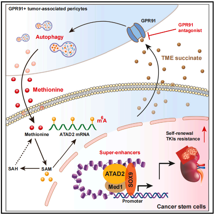 On February 19, 2024, Professor Li Qingquan's team published a research paper entitled "Methanine secreted by tumor-associated pericytes supports cancer stem cells in clear cell renal cancer" in Cell Metabolism. Pericytes are heterogeneous mural cells surrounding blood vessels that are critically involved in malignant progression. In this study, they identified a subset of vascular pericytes, defined by expression of PDGFR-β and GPR91, that promote tumorigenesis and tyrosine kinase inhibitors (TKIs) resistance by functioning as the primary methionine source for cancer stem cells (CSCs) in clear cell renal cell carcinoma (ccRCC). Tumor cell-derived succinate binds to GPR91 on the pericyte surface to activate autophagy for methionine production. CSCs use methionine to create stabilizing N6-methyladenosine (m6A) in ATAD2 mRNA, and the resulting ATAD2 protein complexes with SRY-box transcription factor 9 (Sox9) to assemble super enhancers and thereby dictate its target genes that feature prominently in CSCs. Targeting PDGFR-β+GPR91+ pericytes with specific GRP91 antagonists effectively reduced intratumoral methionine level, eliminated CSCs and sensitized tumors to TKIs. These results described how PDGFR-β+GPR91+ pericytes provide supportive niche for CSCs and therefore could be potential targets for treating ccRCC.