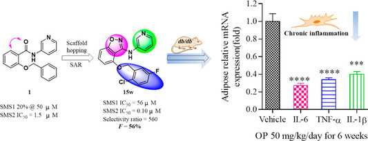 Recently, Prof. Ye’s group reported the identification of 4-benzyloxybenzo[d]isoxazole-3-amine derivatives as potent and highly selective SMS2 inhibitors in Journal of Medicinal Chemistry titled with “Discovery of 4-benzyloxybenzo[d]isoxazole-3- amine derivatives as highly selective and orally efficacious human sphingomyelin synthase 2 inhibitors that reduce chronic inflammation in db/db Mice”( //pubs.acs.org/doi/10.1021/acs.jmedchem.8b00727). Compound 15w is a selective SMS2 inhibitor, which not only attenuated significantly chronic inflammation, but also improved lipid metabolism disorders in db/db mice after oral dosing for 6 weeks, such as attenuation of IL-6 levels in serum, reduction of mRNA levels of IL-6, IL-1β, TNF-α in liver and adipose tissues and improvement of TG,TC LDL-C and NEFA levels.