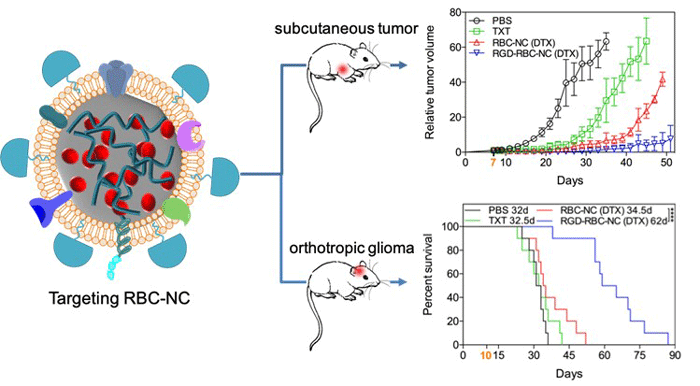 Currently, surgical treatment remains the first choice of anti-glioma therapy in clinics, with radio- and chemotherapeutics as adjuvant therapy. Due to the lack of clear boundary, a complete resection of glioma tissues in surgeries is difficult, leading to rapid recurrence. Meanwhile, the existence of several physiological barriers in brain and glioma prevented the delivery of chemotherapeutics, resulting in limited drug accumulation in tumor site. High-dose administration brings severe side effects as well. How to increase the drug concentration in glioma site for enhanced efficacy and reduced systematic toxicity? To solve this demanding problem, Prof. Lu’s team led an international coordination, studying on the development of an active-targeting biomimetic nanomedicine. The strategies they used included 1) RBC membrane-coated drug NCs: a combination of prolonged retention time of RBC membranes for improved drug delivery and high drug loading of drug NCs for increased drug concentration in tumor sites; 2) Barrier traverse induced by targeting ligands: modification of glioma-targeting ligand on RBC membrane for nanomedicine accumulation in tumor and tumor cells, and thus enhanced therapeutic efficacy.