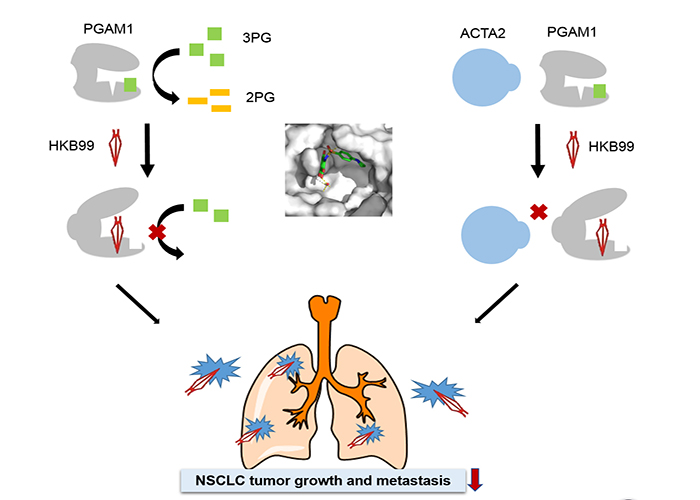 The researchers in Lu Zhou’s lab developed a new PGAM1 allosteric inhibitor (named HKB99) through structure-based drug design and optimization, with the advantages of high selectivity, high activity, and low toxicity. Data showed that HKB99 blocks the synthesis of intracellular macromolecules and disrupts redox homeostasis by inhibiting the conversion of 3-PG to 2-PG. As a result, HKB99 inhibited the growth of non-small cell lung cancer and erlotinib-resistant lung cancer cells. In addition, HKB99 inhibited the metastasis of non-small cell lung cancer cells by disrupting the interaction of PGAM1 and ACTA2 (Figure 1). This further confirmed that PGAM1 is a potential drug target for lung cancer treatment. It provides a prove-of-concept strategy for the development of antitumor drug with a brand new mode of action.