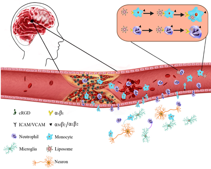 The inflammatory response after CI involves the recruitment of leukocytes (mainly monocytes and neutrophils) to the stroke core and penumbra. This delayed process occurs in the infarcted hemisphere from 30 min to at least 1 week after stroke onset in both human and animals. Secondary inflammation offers a unique therapeutic opportunity by extending the “time window” after CI to enable the effective delivery of therapeutic molecules to ischemic sub-regions and targeted cells in the brain. Professor Qin was devoted to designing such liposome-cell combination carrier based on binding effect of RGD peptide with leukocytes for many years. The present study focused on the cyclic RGD modified liposomes which can bind with leukocytes in vivo. The cRGD-liposomes, carried by leukocytes, could enter the ischemic core and penumbra. Then the liposome-cell system delivered therapeutic molecules to target neuron and microglia though bridge, exosome and membrane fusion, happened between leukocytes and targeted cells. Compared with traditional nanoparticles, the drug concentration in cRGD liposome group was enhanced by 3-4 folds in the ischemic hemisphere, resulting a reduction in infarct size. Such an administration method from center to outside gives a promising prospect for cerebral ischemia therapy.