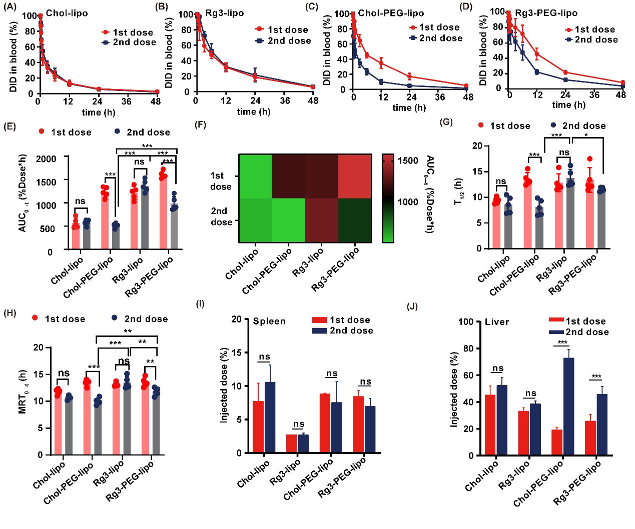 Upon administering the second dose, the prolonged circulation effect of Rg3-lipo was consistent with that of the first dose. In contrast, the half-life and area under the curve (AUC) of Chol-PEG-lipo in the second dose were significantly lower than those of the first dose, with no significant difference compared to those of traditional non-long-circulating liposomes (Chol-lipo). Furthermore, after the second injection, Chol-PEG-lipo accumulated significantly in the liver, surpassing the accumulation in the liver after the first injection. In contrast, there was no significant difference in the accumulation of Rg3-lipo in the liver and spleen after the first and second injections (Figure 4). Thus, unlike the significant ABC effect observed with Chol-PEG-lipo, Rg3-lipo demonstrated sustained prolonged circulation after repeated injections.