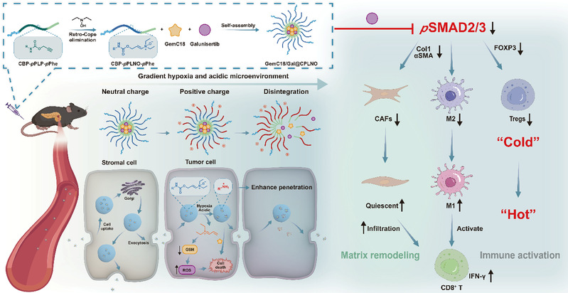 据此,蒋晨、孙涛团队成功开发了一种具有转胞吞和缺氧响应功能的药物递送系统(GemC18/Gal@CPLNO),该功能由烯胺N-氧化物介导。纳米颗粒表面的烯胺N-氧化物触发转胞吞作用跨越肿瘤基质的外层屏障,随后在肿瘤内的缺氧环境中被逐步还原为叔胺衍生物,释放的不饱和亚胺离子可以与GSH发生迈克尔加成反应。同时,聚合物上的赖氨酸残基响应肿瘤的酸性微环境,使纳米颗粒的表面电位从中性变为正电,继续触发转胞吞作用。随后释放的galunisertib可以抑制TGF-β/SMAD信号通路,抑制CAFs的激活,重塑PDAC的免疫抑制微环境,在与吉西他滨联合使用时实现协同治疗效果。