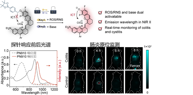 近日,雷祖海青年研究员和张凡教授通过把CX系列染料中类似罗丹明的对称结构换成不对称的类似Rhodol结构,从而创制了系列新型NIR-II荧光染料Chrodol。此系列荧光染料其羟基烷基化或者处于氧负离子状态时因其较大的供电子能力差异,染料的光学性质具有非常明显的区别,处于烷基化的羟基染料没有近红外二区荧光发射,当羟基处于氧负状态时,染料具有较强的近红外二区荧光发射,因此,通过调节羟基的分子内电荷转移(ICT)性质即可构建传感探针。经过系列性质测试,他们选择了系列染料中的Chrodol-3用于探针的构建。将Chrodol-3的羟基与苄基苯硼酸酯相连,得到了可以对碱性和ROS/RNS双重响应的NIR-II分子探针PN910,该探针与底物反应后可以实现近红外二区荧光off-0n的调节。在体外测试中,PN910对H2O2和ONOO-的响应表现出优秀的pH依赖性,活体实验中,PN910可以实现对膀胱炎和肠炎的活体实时监测。