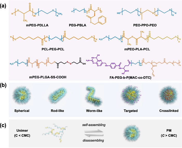 PMs是一类由两亲性嵌段共聚物自组装形成的粒径普遍在10-100 nm之间的纳米载体,共聚物的亲水链与疏水链分别组成PMs的亲水“壳”与疏水“核”。该自组装过程具有动态平衡特性,平衡取决于体系中聚合物浓度与其临界胶束浓度(CMC)。PMs的制备十分简便,并且可通过改变共聚物的成分从而实现PMs理化性质的可控调节,如粒径、形状、电荷与靶向性等(图1)。