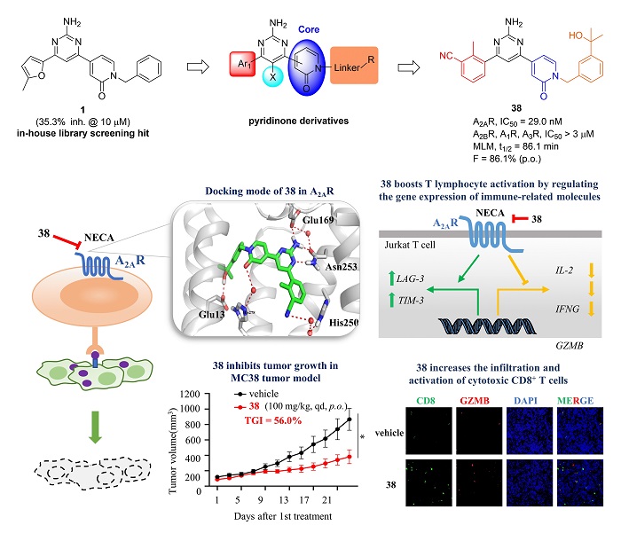 近年来,腺苷A2A受体(Adenosine A2A Receptor, A2AR)的肿瘤免疫学调节功能受到广泛关注,A2AR成为极具潜力的肿瘤免疫治疗新兴靶标。在肿瘤微环境(TME)中,低氧可通过诱导缺氧诱导因子1(HIF-1)和转化生长因子-β(TGF-β)等上调CD39和CD73的表达,增加ATP的酶促水解,导致细胞外腺苷的水平大大增加。腺苷通过激活A2AR产生一系列免疫抑制反应,包括:抑制CD8+ T细胞的细胞毒性,抑制自然杀伤(NK)细胞的杀伤能力,增强调节性T细胞(Treg)的免疫抑制活性等,从而使肿瘤免受免疫系统的攻击。因此,新型A2AR小分子拮抗剂的发现对于开发肿瘤免疫治疗药物具有重要意义。