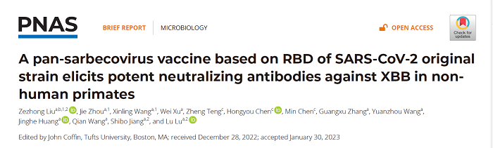Liu Z etal. A pan-sarbecovirus vaccine based on RBD of SARS-CoV-2 original strain elicits potent neutralizing antibodies against XBB in non-human primates. PNAS120(11):e2221713120 (2023).