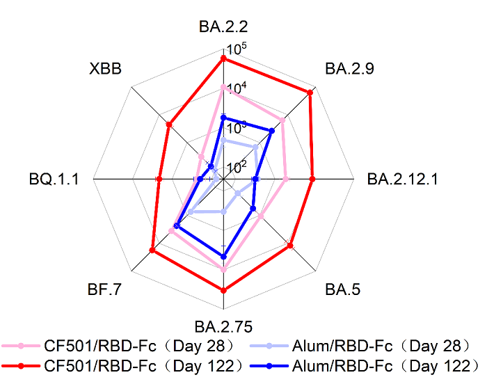 图1. 免疫CF501/RBD-Fc或Alum (铝佐剂)/RBD-Fc的恒河猴在第28天(两剂量)和第122天(三剂量)的血清对奥密克戎变异株亚变体的中和抗体滴度