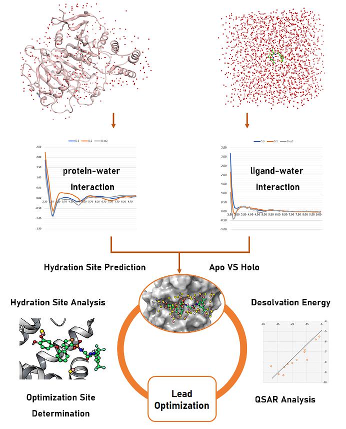 水分子在蛋白-配体结合中的重要性已为研究者们广泛接受。通过对关键水分子的分析可以帮助人们理解一些“反常”的结构-活性关系,指导先导化合物的优化设计。传统基于分子动力学模拟或蒙特卡洛模拟的方法虽然有较高的精度,但是计算非常耗时,且流程复杂,不易于实用化推广。