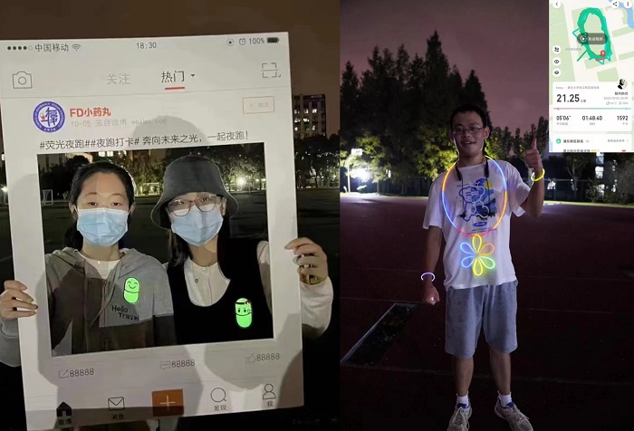 10月5日,骤降的气温阻挡不了竞技宝 跑步爱好者们的热情。晚上七点,约三十位同学在张江操场共同参加了“奔向未来之光”荧光夜跑活动。参与者们佩戴荧光手环,身贴荧光贴纸,成为在黑暗中不断聚集、流转的荧光。他们把轻盈的脚步与多彩的荧光结合,闪耀了张江的天空,点亮了夜色,也一同奔向未来。跑步活动持续两个多小时,大家在跑步中收获了乐趣与健康,更有同学坚持跑完全程,完成了一个半马、21公里的目标。凉爽的月夜下,轻松的假期中,大家共同享受了对突破极限的渴望以及生生不息的追求。