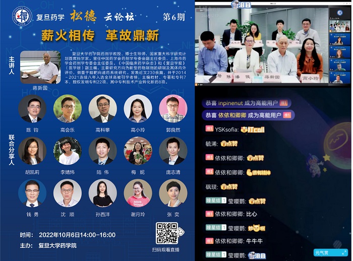 10月6日下午,竞技宝 邀请原药剂教研室主任、国家重大科学研究计划首席科学家蒋新国教授及其弟子和课题组成员线上线下共同分享,举办松德云论坛第6期特别活动。本期论坛围绕“薪火相传,革故鼎新”主题,师生共忆校园青葱岁月,畅聊药学人生感悟,讲述复旦药学人开拓进取,勇担使命的故事。蒋老师从怀念恩师奚念朱教授治学为人经历着手,介绍了竞技宝 药剂学科的发展历史,也展现了一代代药学人秉持创新的观念投身科研强国,振兴医药的历程。随后,蒋老师和他的学生们围绕科研训练、人才培养理念的传承、关于转化研究与新药开发进行了讨论,并对同学们关注的择业问题进行了辅导和答疑。论坛在主持人竞技宝 常务副院长潘俊老师引用奚念朱教授的寄语中落下帷幕,三百六十多名观众相聚云端共同参与本次活动。
